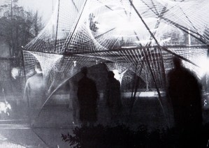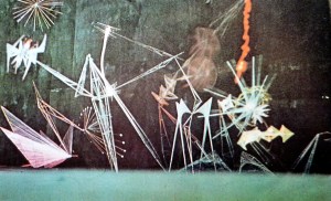 He installed a 3m-high crystalline structure entitled Galaxy in front of the gilded Stalin-era pavilions. This kinetic sculpture was fashioned from metal struts and synthetic string (a clothes line). Electric motors animated the heart of the structure, changing its angular forms to the accompaniment of music, and at night Galaxy was illuminated with coloured lights. The piece represents the aspiration of the group to imagine new models of public sculpture for the new urban centres being planned across the Soviet Union. On the eve of a visit from senior figures in the Moscow Party hierarchy, Galaxy was the subject of an ‘ideological’ inspection. Infante and his colleagues were judged to have gone too far in their enthusiasm for the abstract beauty of geometry, and were required to dismantle the artwork.[12]