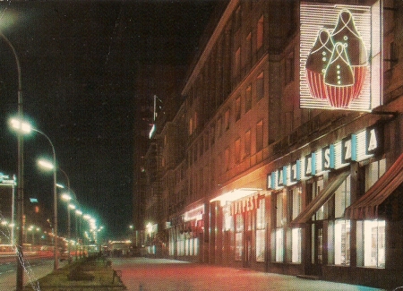 These neon signs originate in ‘moment’ in the late 1950s when elephants climbed the sides of buildings and flowers grew from the glass panes of department stores in Poland. Drawn in neon – an inert gas animated by electricity – these new graphic signs seemed to be irrepressibly alive. Siegfried Kracauer pointed out its tireless energy: ‘Once the images begin to emerge one after another, there is nothing left besides their evanescence.’ In the 1950s, Poland’s modern architects and planners sought to tap this animation to compensate for the deadly monumentalism of the Stalin years. An enchanting antidote to monotony, the new neon signs seemed to open up a bright new future where ordinary human needs and pleasures would be met. They are examples of an obscure and perhaps oxymoronic category, that of ‘socialist advertising’.