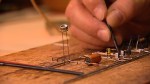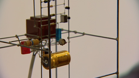 The University of Brighton Gallery is currently hosting a retrospective exhibition of the work of German sound artist Peter Vogel. Spindly frames dressed with transistors and capped with speakers eschew monumentality or anything as straightforward as a message. They are like electronic pets which respond to the presence of people. When a viewer casts a shadow over a photocell or claps hands before the tiny microphones soldered onto the frame, she or he is rewarded with pulsing beats and musical notes. The tonality and modulation of these pieces hints at Steve Reich or the Aphex Twin in a quiet moment. There are no instructions. Is the challenge is to unlock the hidden melodic and rhythmic pattern in the object or, perhaps, to create one’s own electronic music? It is never quite clear who is in command – you or the instrument?