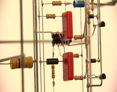 The history of sound art is full of these kinds of modest experiments with interaction. What makes Vogel’s work so charming is the close connection between form and effect. They look like three-dimensional diagrammes featuring actual transistors and speakers, whilst the linear frame suggests the transmission lines of sound or electricity. Transistors also have the unusual advantage in the world of electronics of being visually appealing things. They come in bright colours and sweet-like shapes.