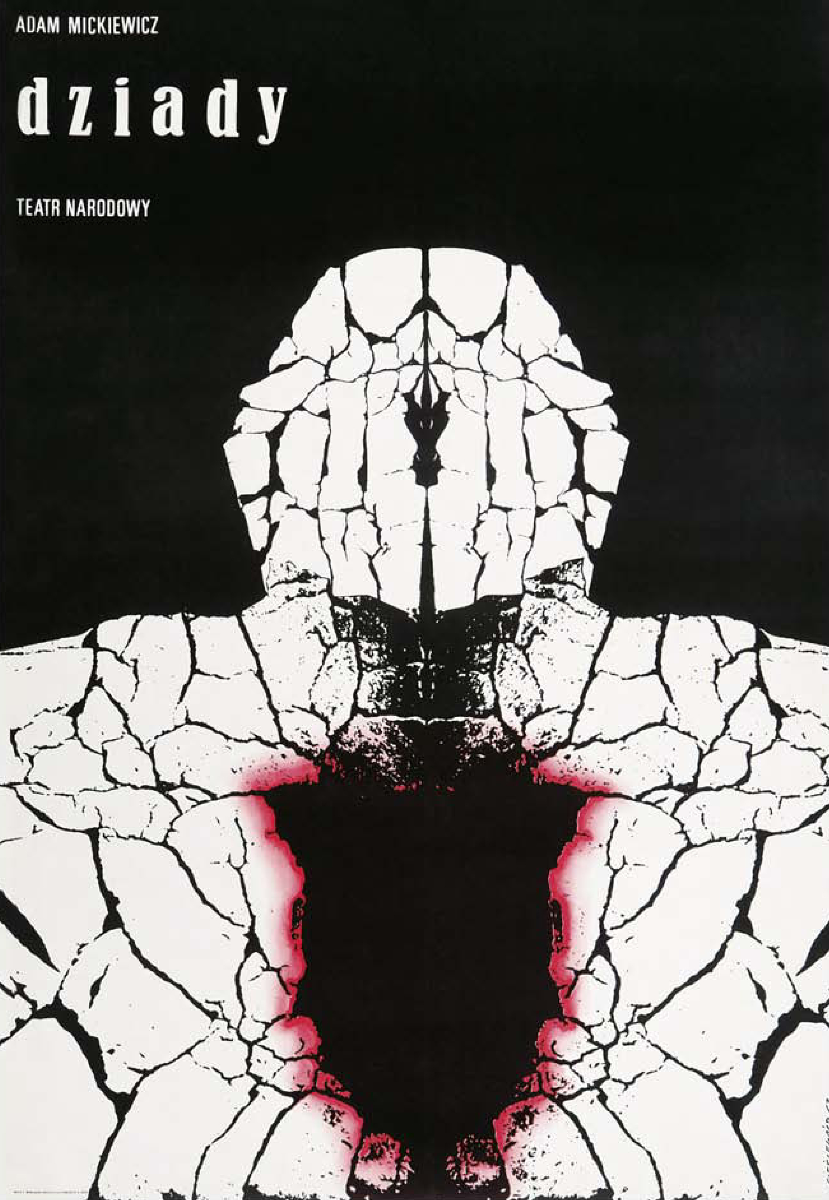 This poster produced by Roman Cieślewicz in 1967 has become an iconic image in the history of the People’s Republic of Poland. Designed to promote a new performance of Adam Mickiewicz’s nineteenth century poetic drama, Forefather’s Eve (Dziady), Cieślewicz’s design captures the simmering frustration with Soviet control over Poland. The central motif seems to be a desiccated landscape or a figure with a hole where a heart might be. In its mirrored composition, Raoul-Jean Moulin found a ‘hallucinatory symmetry.’