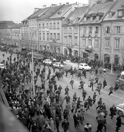Warsaw University students marched through the city and strung banners across the city-centre campus objecting to Soviet interference in Polish life. ‘In fighting for Mickiewicz’s play’ they declared, ‘we are fighting for independence and freedom and the democratic traditions of our country’.