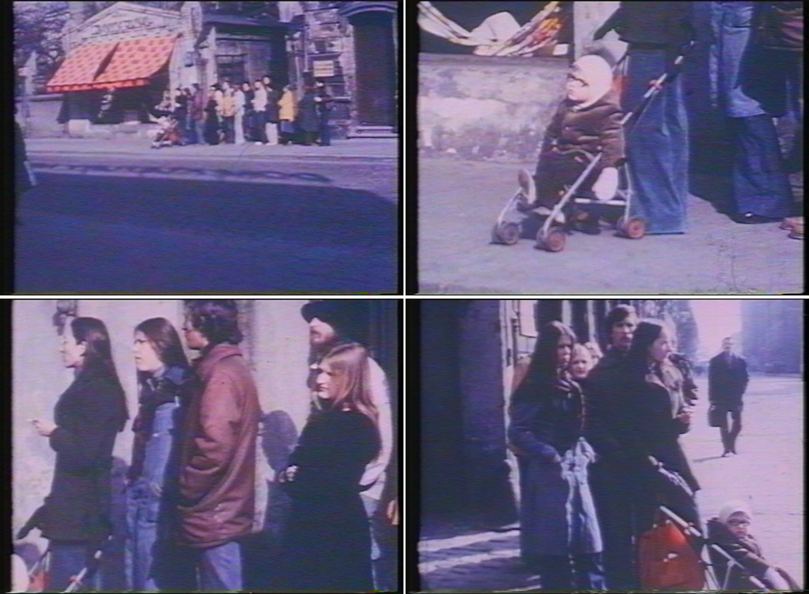 In Queue (Kolejka, 1976), for instance, Akademia Ruchu organised itself as a queue coming out of rather than entering a store. Twenty or so people formed a patient line in front of a butcher’s shop, encouraging passers-by to join its head. At a time when Poland was being characterised as a socialist consumer paradise by the communist authorities, queues and shortages were real features of everyday life. Later that year, Akademia Ruchu arranged a ‘happening’ with the English title, Happy Day, in the centre of Warsaw. Some forty associates of the company suddenly appeared on Krakowskie Przedmieście, a main thoroughfare, dressed in bright costumes and carrying bunches of flowers with fruit and sausages piled high on platters. Vivaldi’s Spring Concerto issued loudly from speakers in the windows of buildings nearby. Lasting just three minutes, the fairy tale ended as unexpectedly as it had begun. The illusions of colourful bounty melted into the grey city. These ‘disturbances into everyday reality’, as Akademia Ruchu director Krukowski put it, were designed to point out the hypocrisy of official images of life in the People’s Republic of Poland.[18] Viewed as street theatre, these acts of queuing for nothing or temporary images of abundance were fantastic and even surreal. In life, they were all too real.