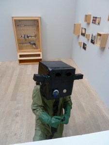 In his Civil Defence series (2009), Szymon Kobylarz addresses a related passion. By searching the Internet and amateur manuals for instructions to construct the kind of devices needed in an emergency, Kobylarz was able to fashion gas masks and grenades. Evidently home-made, these devices betray their origins as coke bottles, food-stuffs and sports equipment. They are exhibited in the kind of tidy vitrines used to store weapons alongside neat drawings reworked from the original instructions. They represent – in material and potentially dangerous form – the kind of unlicensed and uncontrolled knowledge which circulates throughout the world. This potential is dramatised by Kobylarz in the figure of a bomb-maker. His curiously shaped and improvised helmet lends his appearance a monstrous form, perhaps resembling the bull-headed profile of the ferocious Minotaur. What is not clear is whether he wishes to escape detection or whether, if unmasked, his face might betray signs of earlier failed experiments.