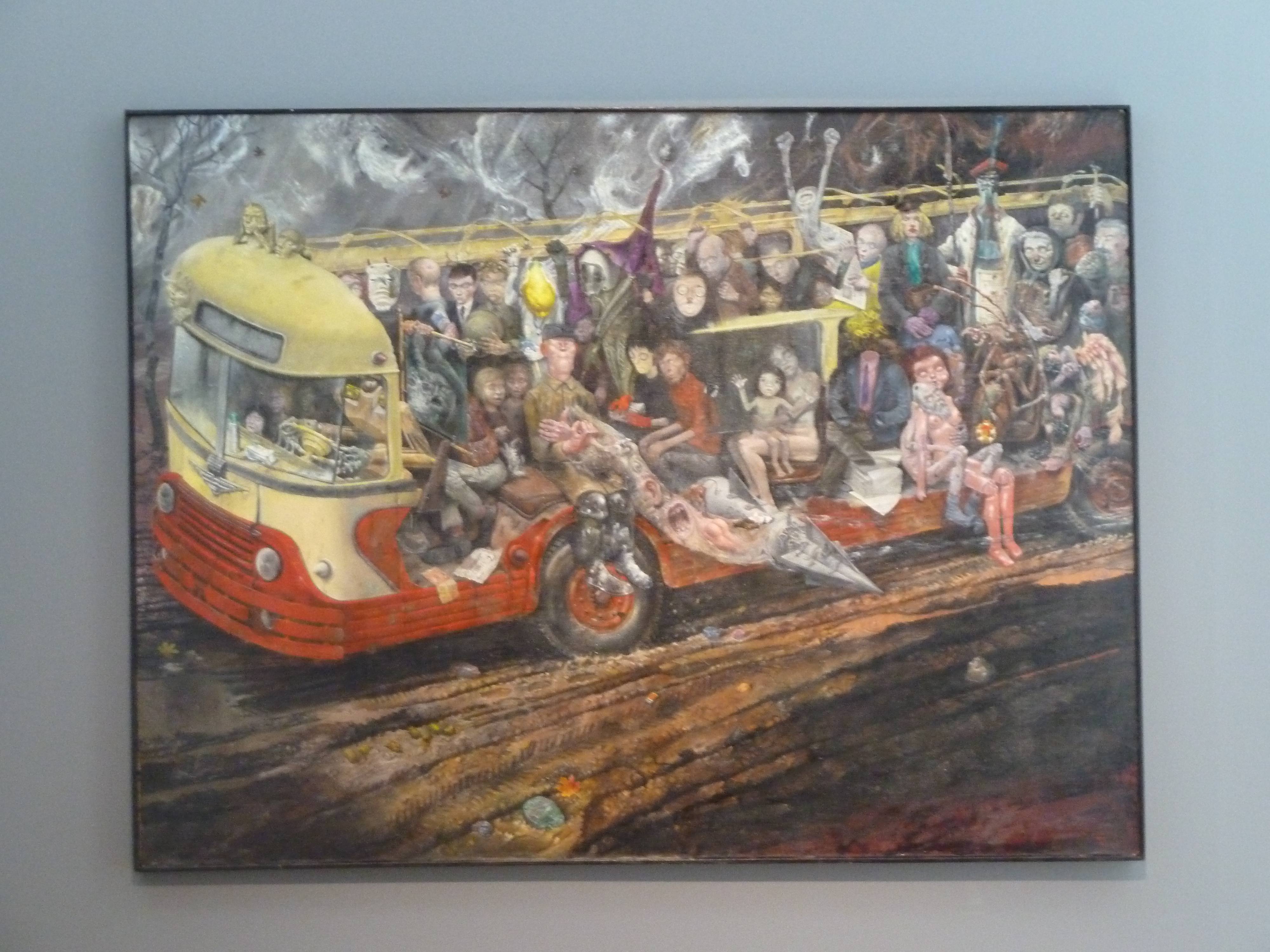 At the same historical ‘moment’, Bronisław Linke, an expressionist painter who had developed a distinctly grotesque visual language before the Second World War, represented post-war Polish society as broken, deranged and spectral passengers on a roofless bus travelling through a nightmarish landscape (Bus / Autobus, 1959–61). Long before Ziółkowski, Linke, too, imagined Poland as being populated by dictators (in this case Stalin), soldiers making obscene gestures, vodka bottles (dressed in traditional folk dress), emaciated victims and human-sized monsters. Although clearly addressing the deep trauma of the Second World War and the new anxieties produced by the Cold War stand-off, Linke’s idiosyncratic and largely pessimistic vision was at odds with the fundamentally optimistic and ‘progressive’ culture being trumpeted by Polish socialists. What kind of new society could be made by such broken souls? On their journey into the future, what fate will befall these people?