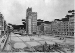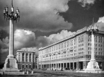 This was to be the blueprint for the future development of all Polish cities. Exercising rational command of the resources of the nation, the ruins of war would be transformed into ordered cities. The futurism of the grand boulevards and monumental residential and public buildings which characterised this conception of socialist urbanism was broadcast loudly: ‘Our country is undergoing a revolutionary transformation’ wrote Stefan Dybowski, Minister of Culture in 1953: ‘A new landscape is in the making on a daily basis. Gigantic buildings are towering in socialism. … Instead of an ageing capitalistic landscape, which, in a sentimental way, neglected civilisation, we are creating a new landscape.’[2]