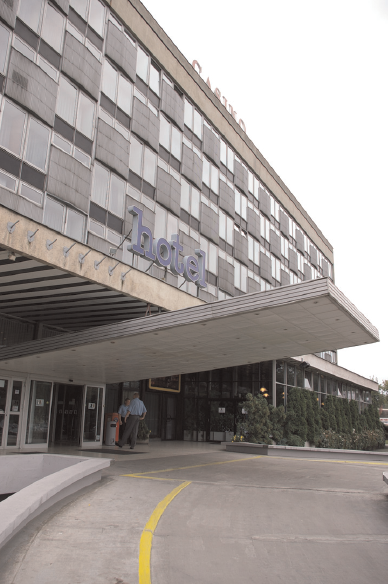 Late modernist hotels often expressed a kind of excessive modernity in their architectural form. Cracow acquired, for instance, a new node in the tourist economy in 1988 when the Hotel Forum (designed by Marta and Janusz Ingarden) opened on the banks of the Vistula river opposite the historic site of Wawel Castle and Cathedral. A massive cantilevered form which was lifted off the ground, it was a statement of technological fetishism. Ultimately it symbolised little more than hubris: it opened on the eve of the disassembly of the party-state in Poland.