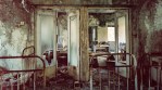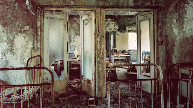 The strange beauty of decay is evident when looking at the eight large format photographic images produced by artists Jane and Louise Wilson in the town of Pripyat in the Ukraine. Close to the Chernobyl nuclear power plant, Pripyat was largely abandoned in 1986 when an explosion spewed large clouds of radioactive material into the atmosphere. The artists revisited the city to produce the ‘Atomgrad (Nature Abhors a Vacuum)’ series. Abandoned interiors – the original purpose of which seems no longer clear – have succumbed to nature. Mould grows on walls in dark ominous swirls; damp has caused the parquet to convulse, making the floor looks like a strange geometric landscape. It is a terrible beauty. Signs of occupation – like the ordinary possessions of the people who once lived in Pripyat – have already disappeared. Soon, all that will be left is the steel and concrete.
