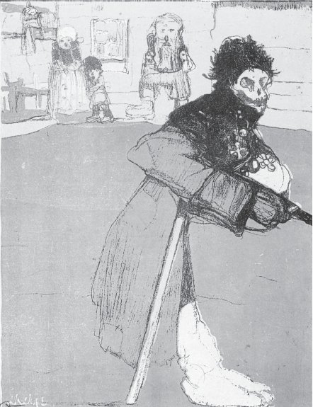 After the conflict had drawn to an end following the Treaty of Portsmouth (September 1905), Wojtkiewicz turned to the tragic consequences of war. In a late drawing entitled “Sława” (“Glory”) produced for a PPSD satirical periodical, for instance, Wojtkiewicz depicted a “Russian hero” back from the East as a one-legged skeleton with his arm strapped to a rifle, decorated with military crosses and medals. The world – viewed through Wojtkiewicz’s eyes – was populated by figures wearing grotesque masks, children playing out adult roles, and amorphous, threatening crowds. Unlike the left-wing imagery which filled the pages of the socialist press – a banal lexicon of radiant angels, rising suns, and muscular workers snapping free of their chains – Wojtkiewicz’s symbolism was enigmatic and filled with foreboding. This effect was heightened by his extraordinary drawing technique which, in its expressive force, seemed like a cry of rage.