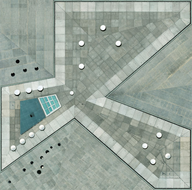The Polish Aviation Museum in Cracow, designed in 2010 by the Berlin architect Justus Pysall with structural engineers Arup, illustrates this desire. The building looks like architectural origami, as if cut and folded from a single ‘paper’ sheet. By photographing all the museum’s surfaces (including the roof from a crane) and then recomposing them as a series of squares, Grospierre has taken this fantasy at face value. The resulting works form a series called ‘Paper Planes’ (2010). Lacking the telltale shadows of aerial photography, the mosaics of concrete and glass textures are emphatically flat. Like a looping fold, an imagined horizontal surface is transformed into the undulating form of the museum and then back to the original fantasy in photographic form. And in a playful gesture which points to another dream, namely that photography can escape its flat world, Grospierre folds these sheets into massive paper airplanes.