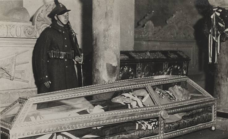 The most important event in the Piłsudski Cult was, inevitably, that of the funeral of its principal figure, the Marshal himself. A controversial affair which drew the regime and the archbishop at Wawel into sharp disagreement about the entombment of a former socialist and solider in the resting place of kings, Piłsudski’s funeral took place there in May 1935. His body was embalmed and displayed with his saber, his ‘maciejówka’ (cap), and other ceremonial symbols of rank in a glass coffin. Initially his coffin was placed in the Saint Leonard crypt, alongside the tombs of King Jan III Sobieski and Kościuszko. This could not be a permanent arrangement. The Marshal’s body had not been well preserved and the journey from Warsaw to Wawel – not least on the bumpy cobbles of Kraków – had damaged the air-tight seal of the glass coffin: in consequence, Piłsudski’s body began to deteriorate.[13] The coffin was replaced within months by another designed by sculptor Jan Szczepkowski, albeit without great success: the body continued to decay. Moreover, the crypt itself was inadequate. It was damp and could not accommodate another sarcophagus or the large numbers of pilgrims. They often arrived in festive mood, much to the displeasure of the archbishop.