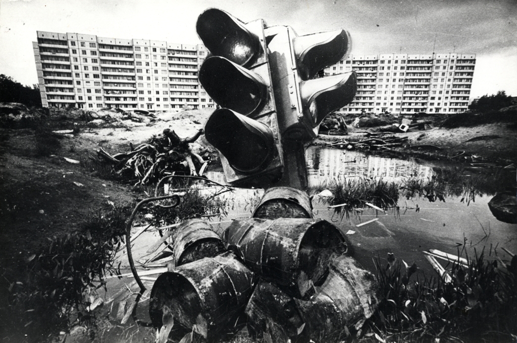 Ārgalis, Borgs and Celms – along with Kirils Šmeļkovs, Kārlis Kalsers and others – were also members of the Pollucionistu (the Pollutionists) group which in the late 1970s created a remarkable and extensive body of images which commented on the failures of late Soviet system to meet not just its promises of utopia but also its loud claims on beauty and utility. Walking through Riga, the Pollucionistu photographed new panel-construction estates and nineteenth century housing; side streets and back alleys; as well as the slow progress of repairs to the city’s streets. Their interests were neither in the historic landmarks of the city nor the ostentatious monuments to Soviet order which formed the conventional points on an official guided tour. Instead, it was the slow unmanaged entropy of the Soviet environment which drew their cameras.