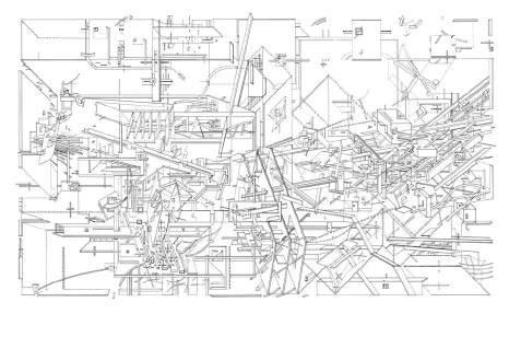 In other words, new buildings are typically lines before they are volumes and structures. The indirect nature of the architectural drawing is not its only paradox. On a plan or section, precise lines of geometry mark the edges and position of “fixed” elements like windows, walls and ceilings, but architects since the early twentieth century, if not earlier, have declared an avowed interest in the continuous flow of space and movement. Famously, Adolf Loos was the champion of the Raumplan,[27] an idea he realized in the spiraling arrangement of split-level floors through the Villa Müller in Prague (1930), and at around the same time, Le Corbusier developed the notion of the promenade architecturale, a ritualistic conception of architecture as a path through spaces organized to enhance perception.[28] Movement presented a limit to the conventional architectural plan, one which architects sought nevertheless to overcome by developing new graphic devices and techniques over the course of the twentieth century. Architect Daniel Libeskind, who led the reinvigoration of the architectural drawing in the 1970s, wrote in 1981: