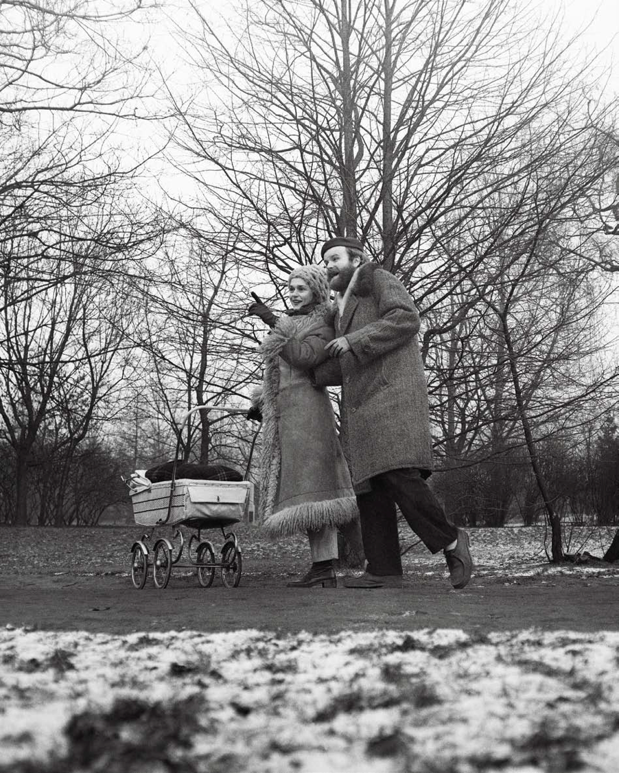 Zofia Kulik and Przemysław Kwiek with a pram on the route of their daily stroll in the Praga Park in Warsaw (December 1972). The Park is situated between their Studio of Activities, Documentation and Propagation (PDDiU), and the Zoo. Here, they are seen enjoying a break from their everyday duties and the work on “Activities with Dobromierz”, featuring their little son Maksymilian Dobromierz. Zofia is sporting a fashionable and expansive sheepskin coat (a gift from her first husband), a garment every citizen desired. Przemysław is wearing an overcoat made of pre-war hand-woven “herringbone” homespun inherited from his grandfather. The coloured brown beret on his head was tailor-made by a hatter. [Fig. 1]