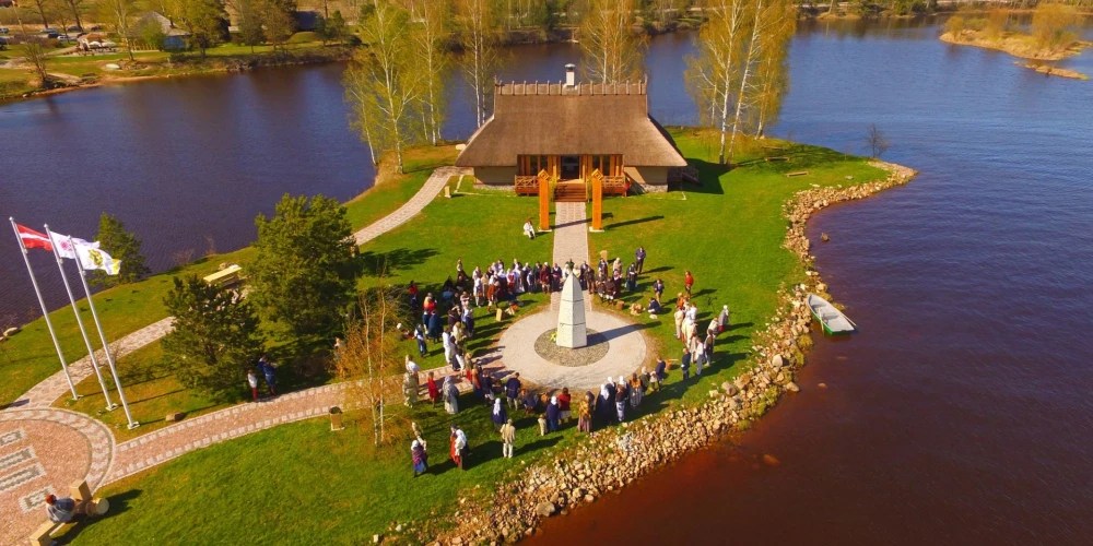 The second Celms is a guru of Latvijas Dievtuŗu sadraudze (Community of Latvia’s Dievturi), the group which has led a revival of pre-Christian religiosity after its suppression during the Soviet era.[7] With its roots in late national romanticism and the politics of independence after 1918, Dievturība neo-paganism has had a strongly national orientation. Throughout its modern history, artists have played a central role in visualising Dievturība beliefs in paintings and works of applied art, and by cataloguing the cosmological symbols found in traditional Latvian peasant art. During most of the period of Soviet rule, Dievturi adherents kept silent, unable to practice their beliefs in any organised manner. But, there has been a concerted effort to reconstruct the ancient religion since the 1980s by drawing on folk songs, peasant ornaments, archaeological sites and folk beliefs. Sacred sites have been discovered too, sometimes selected because of the visions which have been reported to have been experienced there (such as accounts of flaming balls in the skies above the pine trees and sacred stones of the Pokaiņi forest). New rituals to mark baptisms and marriages or the holy days of Dievturība deities have been created too. Celms has contributed much to this activity as the author of a 2016 book Baltu dievestības pamati (Fundamentals of the Baltic Religion) which records the pantheon of Dievturība gods, and as one of the creators of the Lokstene Shrine on a small island on the Daugava river in 2017 (image above). Visitors enter this temple-like structure through a gate of twin poles topped with solar symbols (referring to Saule, the sun goddess) and the shrine building itself features symbolic representations of the moon on its gable ends (signalling an association with Mēness, the Dievturība goddess who governs emotions).