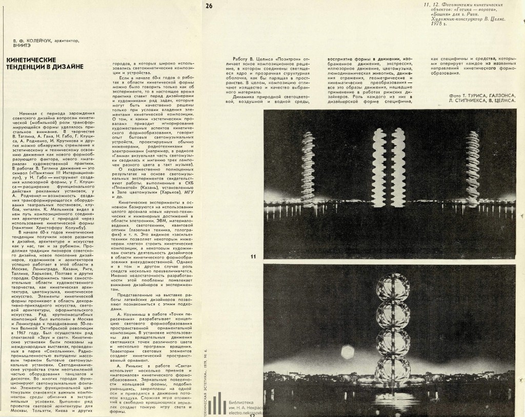 Celms was not active in Moscow or St Petersburg, but he clearly felt a kinship with the Dvizhenie artists and with Koleichuk in particular who was attached to the Moscow branch of VNIITE All- union Scientific Research Institute of Technical Aesthetics), an institution that had been founded in 1962 to advance design research. In the 1970s Koleichuk led a VNIITE research team dedicated to the ‘artistic problems of form-creation’ (khudozhestvennykh problem formoobrazovanii͡a).[20] Celms and Koleichuk shared a curiosity with contemporary experiments with Op and Kinetic Art in the West, as well as with the experimental schemes of the Soviet avant-garde of the 1920s, once a suppressed topic but now a burgeoning theme in VNIITE’s house journal, Technical Aesthetics (Tekhnicheskaya estetika, published from 1964 onwards). Celms recalled that the monthly ‘was very theoretical … I studied it diligently, taking notes. It featured the latest theories from around the world, as well as all the experiences of the 20th century — Vkhutemas, Bauhaus, and their own developed theories’.[21] Celms visited Koleichuk in Moscow in 1970, who took him on a tour of the Soviet Exhibition of Achievements of the People’s Economy – the VDNKh exhibition grounds where VNIITE was located.[22] Koleichuk’s hospitality was reciprocated in 1978 when Koleichuk headed to Riga to review the Form.Colour.Dynamics exhibition which Celms organised with Andulis Krūmiņš and Artur Riņķis, designers from the Riga Research Institute of Radioisotope Instrumentation. Fifty exhibits were installed in St Peter’s Church, each spot-lit in near-darkness. Recently restored after a fire in its spire, the massive church in the city centre was scheduled to become a museum of construction history. One suspects that the tenebrous and cavernous setting added considerably to the atmosphere. Exhibits included Celms’ Pozitron montages, Riņķis’ projections of light through perforated steel plates that he called Guiding Stars and Andulis Krūmiņš’ light fountains (Celebrations). Reviewers seem to have been particularly puzzled by status of these immaterial works. What were they? And what purpose did they serve? One of the two reviews of the exhibition in Technical Aesthetics ruminated over the paradox of the category of ‘unique designs’ into which most of the exhibits fell: ‘As demonstrated by the exhibition in Riga, “unique design” also involves objects of high technical complexity, though in the vast majority of cases, their importance lies less in their practical application and more in their innovative artistic and experimental value.’[23]