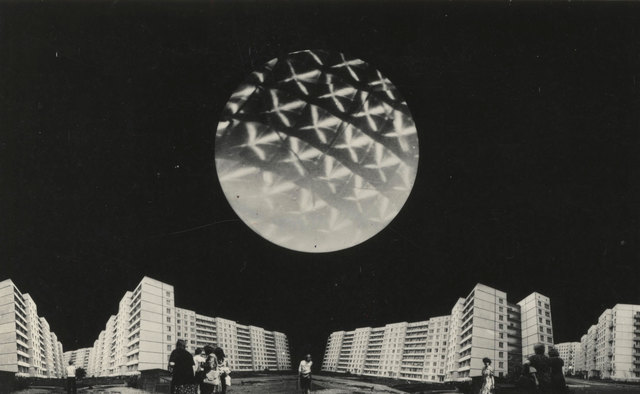 One explanation for this duality of Celms’ life and creativity lies in the emergence of independent Latvia in 1990 which had hitherto, as a Soviet republic, been forcefully obliged to yield to an ideology which eschewed religion and declared its faith in the materialism and science of Marxism-Leninism. Currents of religiosity and Latvian patriotism which had been repressed before 1991 could thrive once again. These facts are true but they don’t adequately capture the ways in which esoteric or metaphysical thinking penetrated many zones of life in the Soviet Union, even the most rational fields of science and technology. Nor does it help us to recognise the lines of continuity in Celms’ work over his long and extraordinary career. Consider his Architectural Proposal for a Kinetic Light object ‘Balloon’, one of a number of visionary montages that he produced in the late 1970s (above). In it, a massive spherical ‘moon’ appears to orbit a landscape of panel construction housing blocks of the kind that were then being built in their thousands throughout the Soviet Union. The motif was a variant of his ‘Pozitron’, a kinetic art work for the grounds of a Ukrainian electronics concern that he’d first developed in 1976. Bathed in different colours to indicate work- and festive-days in the Soviet calendar and turning on its axis, the massive sphere had been conceived by Celms as a kinetic monument.[8] Never realised, it belonged to a genre of Soviet public art works which took humanity’s command of the atom as their theme. By contrast, Balloon eschewed the question of practical realization. As a sublime ‘proposal’ rather than a practical blueprint, Celms’ Balloon escaped the pull of Earth’s gravity as well as the limits of Soviet engineering to become a second moon, a cosmological phenomenon. Another collage bearing the rather New Age title of The Way (1979) combines ancestral Latvian ornamental patterns with the regular arrangements of balconies in a housing block. Using perspective to suggest ascension, Celms’ image offered a path into the reaches of space that seemed to begin in the most humble point possible, a stitch on a peasant belt.