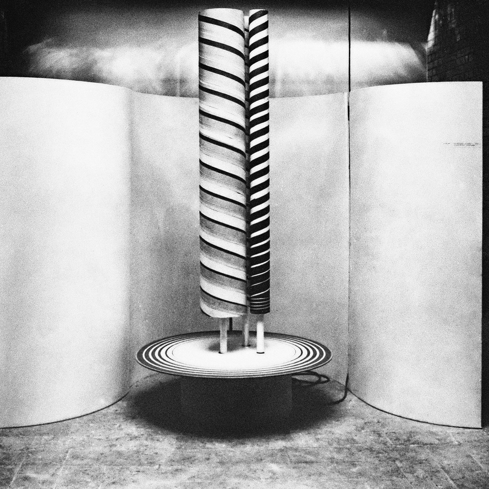 There would seem to be at least two Valdis Celms. The first is the designer and artist who created some of the most ambitious works of kinetic art in the Soviet Republic of Latvia in the 1970s.[1] Subscribing to the historic avant-garde vision of a future where art had left the walls of the gallery to infuse the settings of everyday life, his output included works of kinetic sculpture and light art, often intended as proposals for public monuments, and visionary urban schemes designed to revive rundown city districts. Some were realised, not least Dziesma, Celms’ electrokinetic light device for the bar of the Hotel Latvija (1980). Photography formed another key line of creative enquiry, often in the form of fantastic photomontages and collages where the ‘rules’ of photographic realism were suspended. Working in close partnership with fellow artists and designers, he organised exhibitions of boldly abstract art in Riga such as Form.Colour.Dynamics (Forma.Krāsa.Dinamika, 1978) at a time when ideological prohibitions against modernist art were still in force. He was also a theorist, penning articles for Soviet era publications on the concept of ‘design photography’;[2] on the psychological effects of kinetic art;[3] and criticism of poor architectural and urban design.[4] His practice spanned architecture, art and design in ways that stressed their interconnection: ‘design’ provided an alibi of future usefulness that permitted a degree of formal experimentation denied to the mainstream of Soviet art.[5] A key early work for Celms, for instance, took the form of the tall rotating cylinders that he exhibited in the 9th Exhibition of Republican Work by Young Artists mounted in the former Stock Exchange in Riga, then the home of the Latvian Republic Institute of Scientific-Technical Information and Propaganda. (Above) The candy-coloured stripes wrapping the cylinders created a compelling spiralling effect when turned. An experiment in perception and colour, these ‘designs’ offered little immediate practical utility. Highly productive, Celms was at the heart of Latvian art and design apparatus during the Soviet era, and a key figure in the regime’s modernisation project (though this fact did not necessarily protect him from attack by distrustful officials[6]).