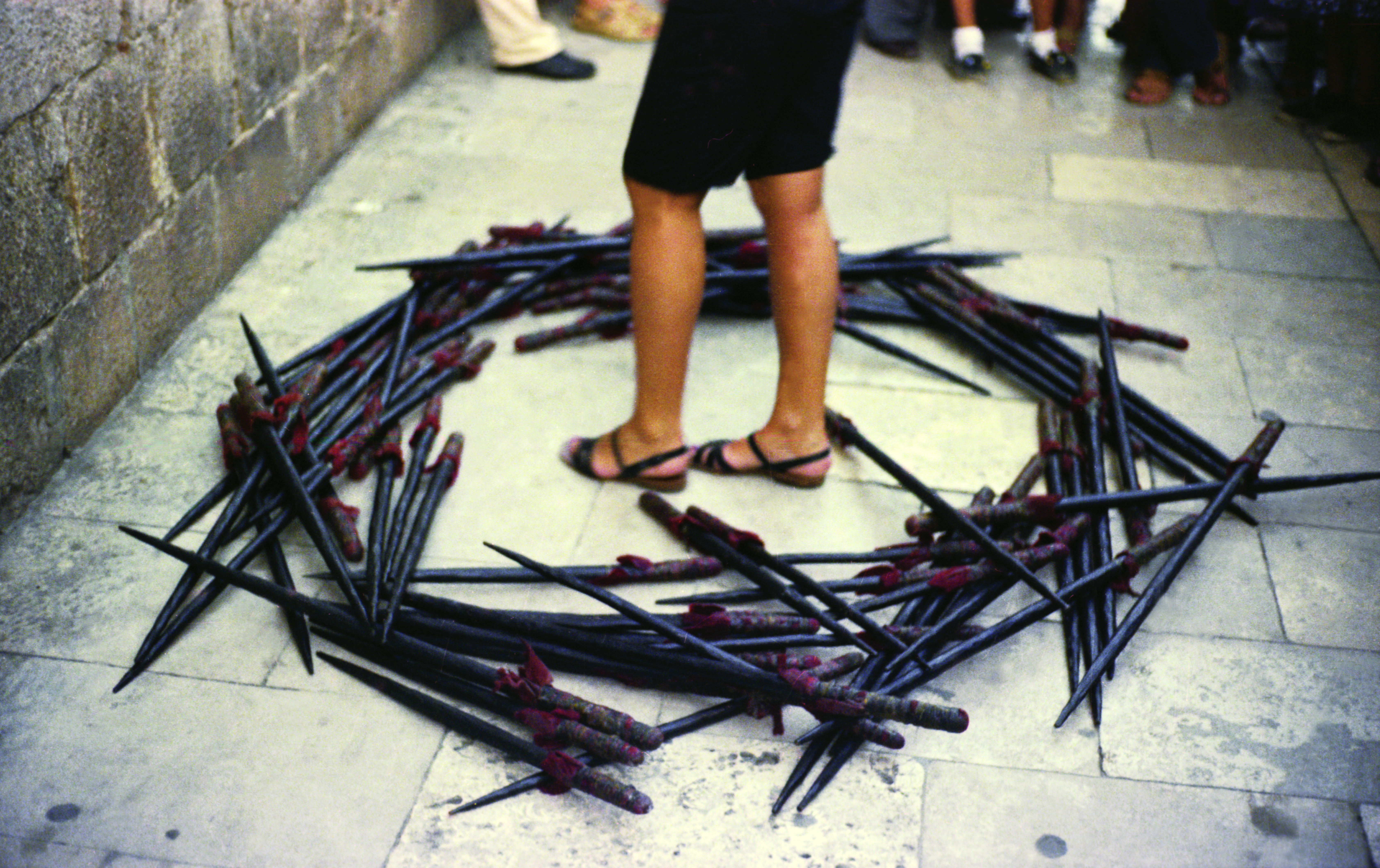 Indeed, she performed one such act in Dubrovnik as part of the city’s Ljetni igre (Summer Festival) in 1981 (left). Responding to the festival’s invitation extended to dancers, theater companies, and performance artists to use the historic fabric and atmosphereof the city’s squares and streets as an inspirational backdrop, Schubert undertook a ritual in a small square beside a fifteenth-century public fountain. A slight figure, Schubert carried seventy-two torches—wooden staves wrapped with rags at one end and sharpened at the other—in bundles inside a rough sack into the square. Tourists dressed in summer T-shirts and shorts watched on. Schubert untied each bundle to lay serried ranks of torches on the flagstones, before creating an irregular crown formation of the staves into which she stepped. This was a threshold of her own making, though perhaps it was a latter-day variant of the protective circle that appears throughout Slavic mythology in the form of peasant dances, fire rituals, and boundary markers. She then reversed the action. All the while, the torches remained unlit.