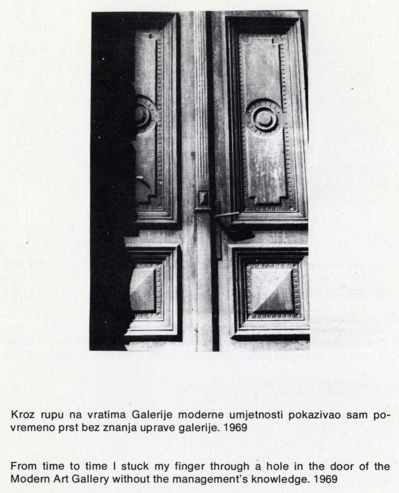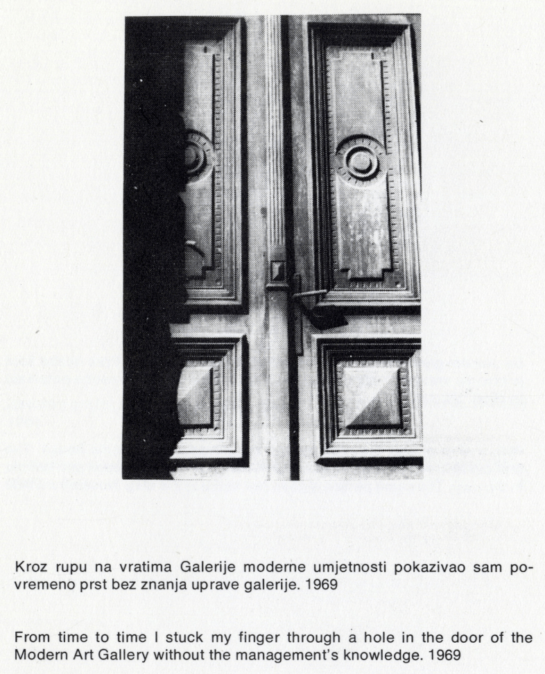 Doors were not new to Yugoslav art in 1978. Indeed, they had appeared in the early days of the New Art Practice, used to ask questions about what art might be, who could be an artist, and where art might be experienced. In Zagreb in 1969, young artists Braco Dimitrijević and Goran Trbuljak had persuaded passerby Tihomir Simčić to press his hand into a lump of clay where a doorknob should have been at the entrance to a tenement building on Ilica Street. Simčić accepted their proposition that he was now an artist and signed the clay sculpture that his grip had made. Soon thereafter, and now working under the name Penzioner Tihomir Simčić (Pensioner Tihomir Simčić), Dimitrijević and Trbuljak discovered an entrance to a tenement on another Zagreb street and persuaded the tenants to let them open a gallery, where five brief shows were held in 1970–71, including a now much mythologized three-hour exhibition of international Conceptual Art curated by Braco Dimitrijević and Nena Baljković-Dimitrijević called At the Moment.7 Their intention to democratize art was also addressed by Goran Trbuljak—critically and wittily—in a document recording an action featuring an image of a solid paneled door, accompanied by a legend (in English and Croatian): Kroz rupu na vratima Galerije moderne umjetnosti pokazivao sam povremeno prst bez znanja uprave galerije. 1969 / From time to time, I stuck my finger through a hole in the door of the Modern Art Gallery without the management’s knowledge. 1969 (left).
