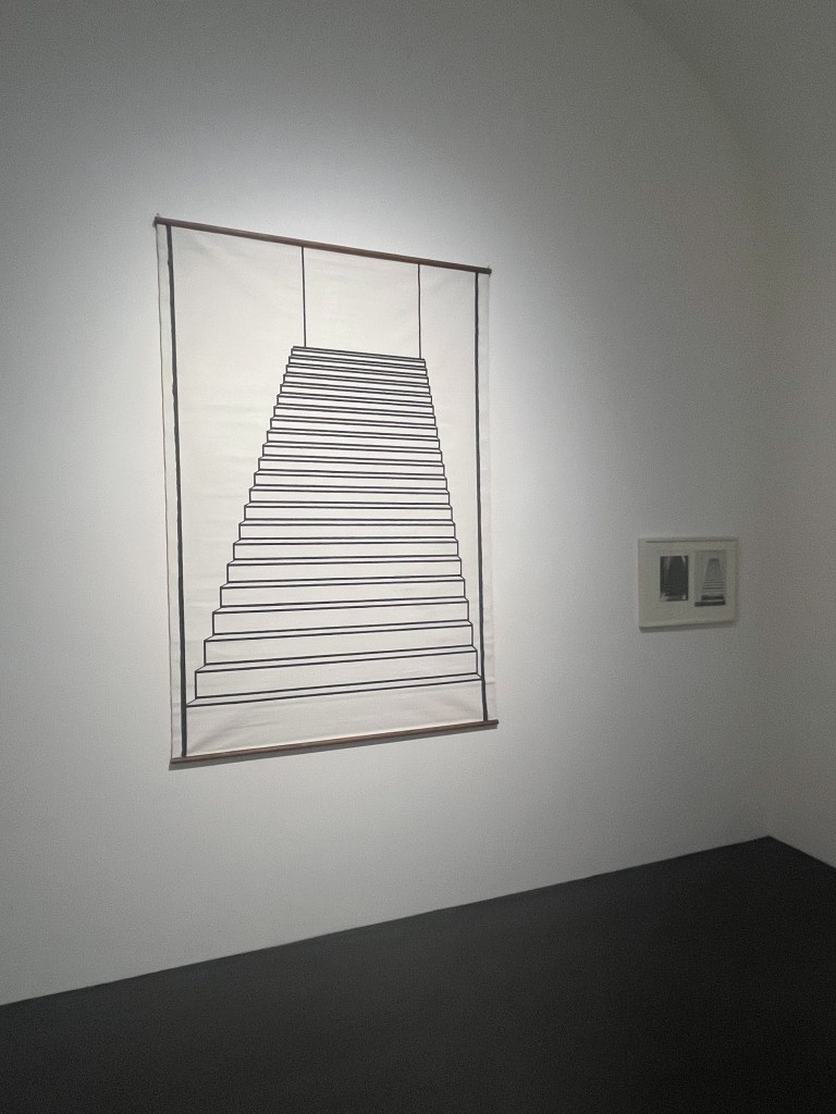 In the same year as the Doorway canvases, Schubert also produced Staircase (Stubište), perhaps a “life-size” painting of the stairs that led up to her attic studio in the institute. Adapting her own shadowy and evocative photographs that captured the erstwhile grandeur of a building from the last Habsburg years—with high ceilings, polished wood balustrades, and ceramic-tiled floors—she produced another schematic representation. In the translation of the photo to drawing, Schubert stripped out the historical details to produce a universal image of a staircase. When she created the painting, she also arranged for two small timber steps to be made. Placed on the ground immediately below the canvas, they extended the sense of perspectival recession in the flat image. In this gesture, a passage between floors in a building was also turned into one between the material and the immaterial world.