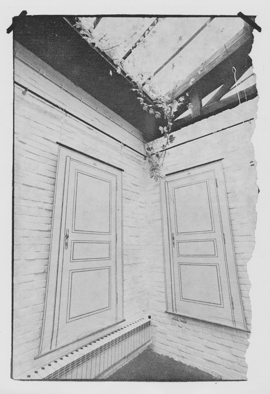 It was the way in which the door handle reached out that appealed to Demnievska (a gesture that Juhani Pallasmaa has memorably called the “handshake of the building”10). Schubert’s doors eschewed such everyday interactions: there was no doorknob to be grasped, no key to be turned in the lock. No scene could be glimpsed, even through the keyhole. They also rejected the publicness that had motivated Trbuljak and others associated with the New Art Practice. But even when closed, doors like those created by Schubert remain open to the imagination. A room with more than a dozen identical, impassable doorways in a Zagreb gallery was kin to Jorge Luis Borges’s hallucinatory labyrinths or the famous scene in Lewis Carroll’s Alice’s Adventures in Wonderland (1865), in which a tiny gold key refuses to open the doors that flank the hall in which Alice is trapped. Something of this fantastic quality was accentuated by Schubert when she presented her door paintings in the publication accompanying her Students’ Center Gallery exhibition as documents with torn edges and taped-over corners, as if precious records collected in a scrapbook or filed as evidence—though of what, she did not reveal.